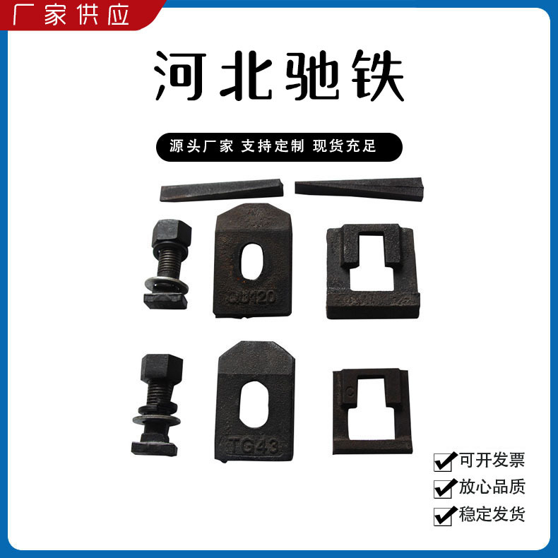 主要產(chǎn)品:鐵路配件、行車配件、工礦配件、魚(yú)尾板、道釘、壓軌器、軌道壓板、軌距拉桿、護(hù)軌扣板、T型螺栓、魚(yú)尾螺栓、彈條、軌距擋板